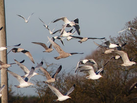 I walked him down the footpath to the stubble field were I saw the bird earlier in the week. Today it was completely devoid of birds! Still we got some exercise. As I returned to the car I could see around half-a-dozen birders stood in the paddock. They didn't seem focused and it was starting to snow again so I wimped out and headed for the car. It was 2.30 now (no dental pun intended) and I fancied another crack at the Gulls. I checked the first group again from the car with my bins. There were still a few snow flurries and visibility was poor.